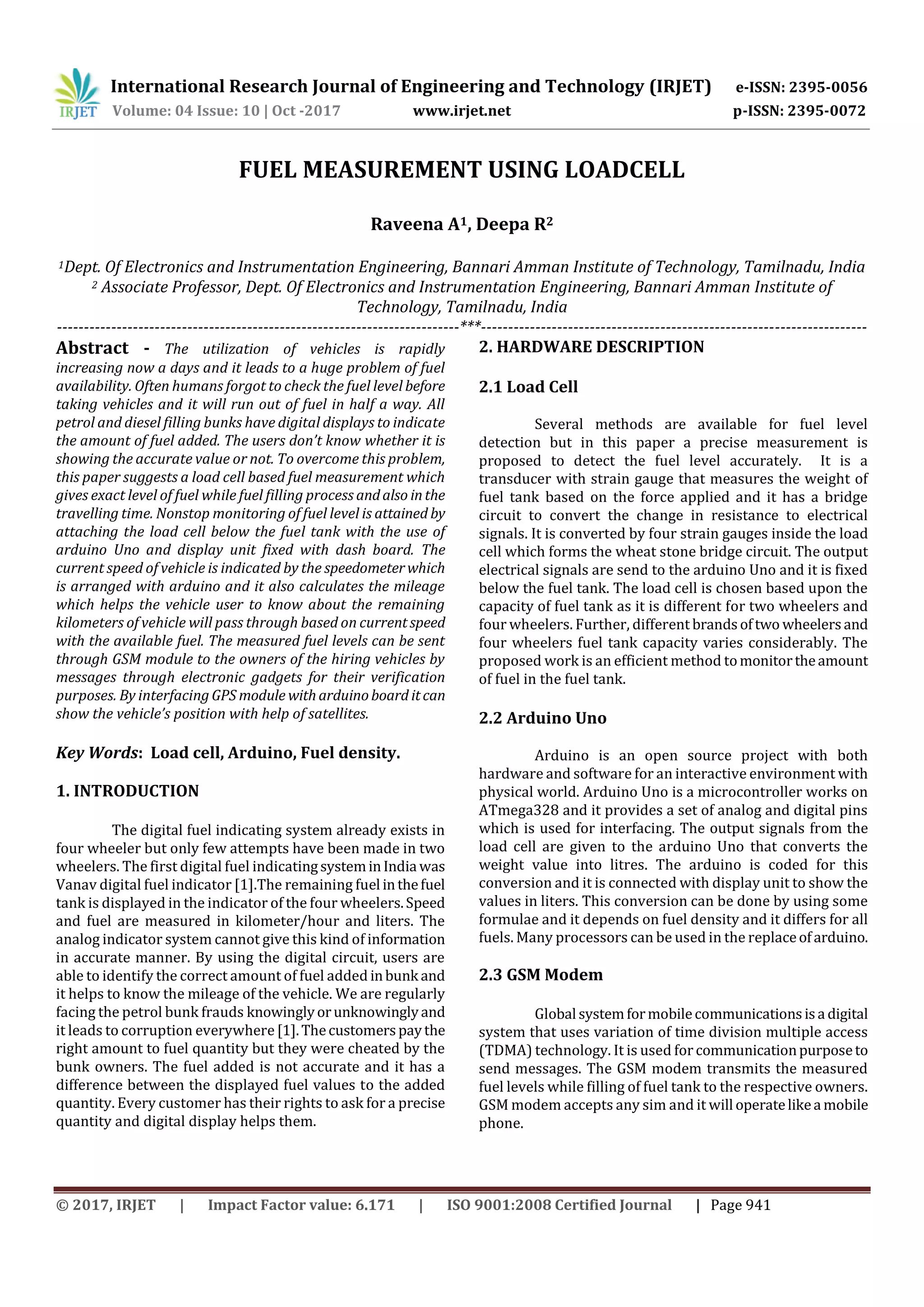 1) The document describes a system for measuring fuel levels in vehicles using a load cell attached below the fuel tank. The load cell measures the weight of the fuel tank and sends signals to an Arduino board.