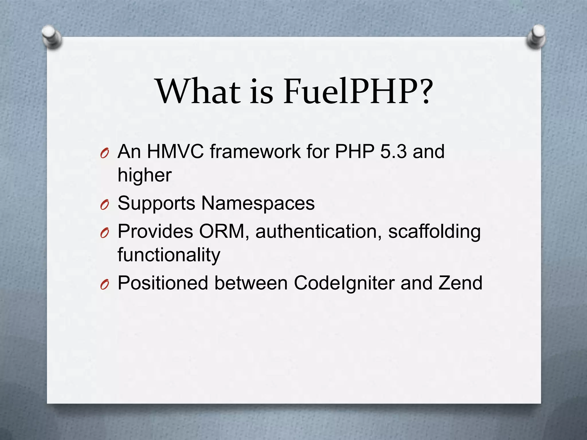 FuelPHP is an HMVC PHP framework positioned between CodeIgniter and Zend. It started development in 2010 and supports namespaces, ORM, authentication, and scaffolding. While some initial developers left for Laravel, FuelPHP continues development with a focus on version 2.0 improvements and maintaining a stable API. Benchmarks show it has Symfony-like performance for simple applications.