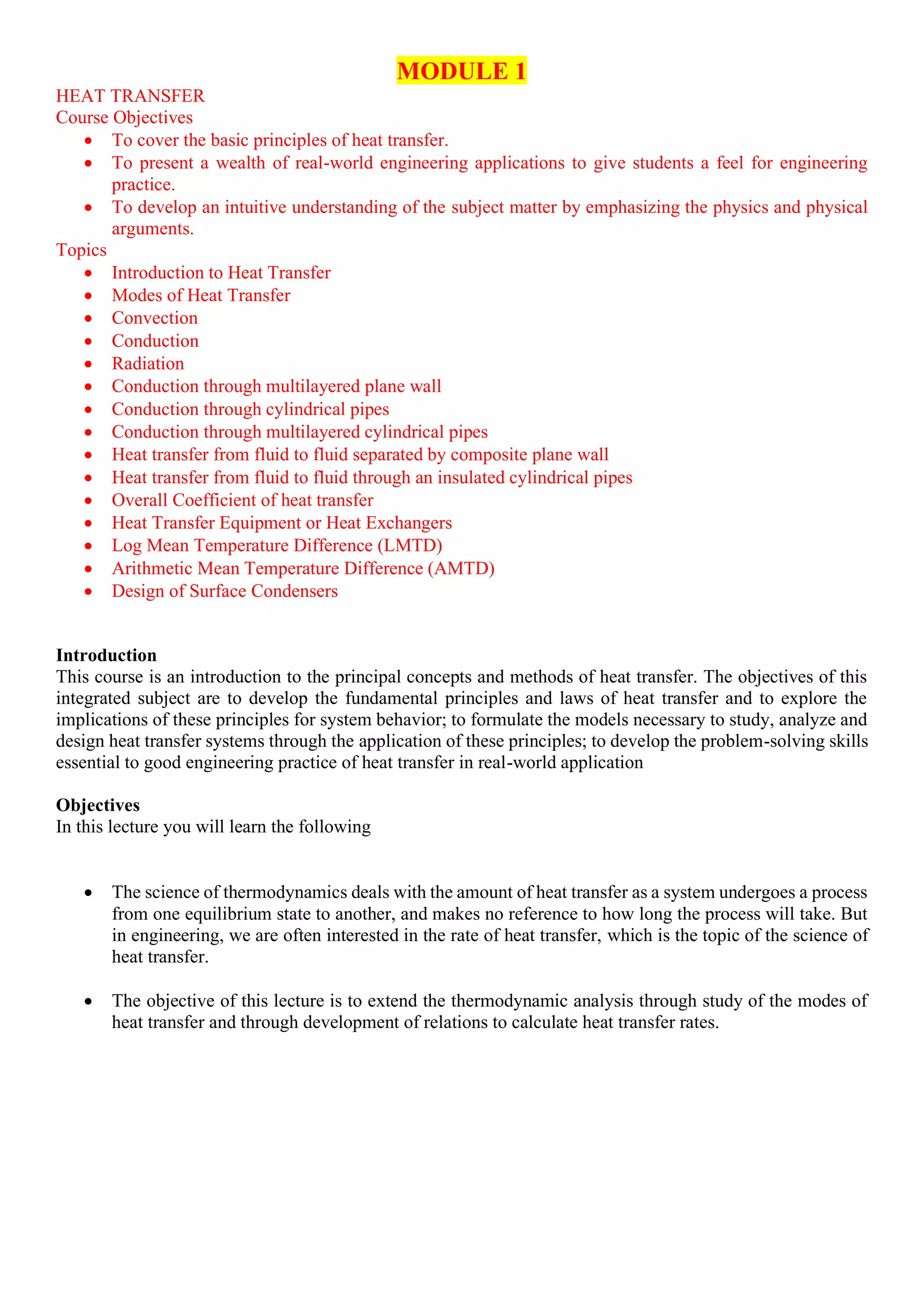 This document provides an overview of heat transfer topics covered in a module, including objectives, topics, and introductions. The key topics are the three modes of heat transfer - conduction, convection, and radiation. Equations for calculating heat transfer via these three modes are presented, including Fourier's law of conduction, Newton's law of cooling for convection, and the Stefan-Boltzmann law for radiation. Examples of combined radiation and convection heat transfer are also discussed.