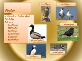 UglaRjúpaLandfuglar eru ósamstæðurflokkur þar sem safnað er saman land- eða þurrlendisfuglum, öðrum en spörfuglumAfar lítið er um landfugla eða skógarfugla hér á Íslandi