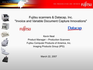 The document discusses Fujitsu's innovations in invoice and variable document capture, emphasizing the integration of network scanning solutions and the features of Fujitsu's production scanners, particularly the fi-5900c model. It highlights the advantages of using multifunction peripherals (MFPs) alongside production scanners for improved document capture and processing efficiency across various industries. Additionally, the document details advanced features like ultrasonic sensors and the intelligent multifeed function for enhanced document protection during scanning operations.