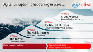 Digital disruption is happening in waves through the internet, mobile internet, internet of things, and AI/robotics. Digital transformation creates both value through increased revenue and efficiency, as well as challenges in managing data, processes, and analytics. Co-creating digital business involves designing a disruptive vision, business model, and digital architecture in collaboration with ecosystem partners and customers.