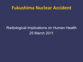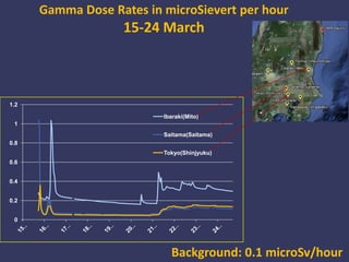 This document summarizes radiological data collected after the Fukushima nuclear accident in Japan on March 25, 2011. Gamma radiation levels exceeded background levels of 0.1 microSievert/hour in some areas. Additional deposition of radioactive iodine-131 and cesium-137 was detected in 7 prefectures, with levels found in food and water samples. The Japanese authority implemented restrictions on distribution of milk, vegetables and drinking water from contaminated areas. Three workers at the plant were exposed to radiation levels under permissible emergency exposure limits. International monitoring teams were assessing radiation levels and food safety.