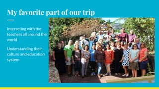 The document details the experiences of Vinayadhar Raju during the Teaching Excellence and Achievement (TEA) program in the United States in 2017, highlighting interactions with global educators and insights gained into technology integration in education, co-teaching, and cultural exchange. Key learnings included the use of Google Classroom for managing assignments, understanding the US education system and cultural practices, and implementing teaching strategies in an Indian context. Additionally, it covers training and certification requirements for teachers in the US, classroom dynamics, student behavior, and societal observations on women's empowerment and the cost of living.