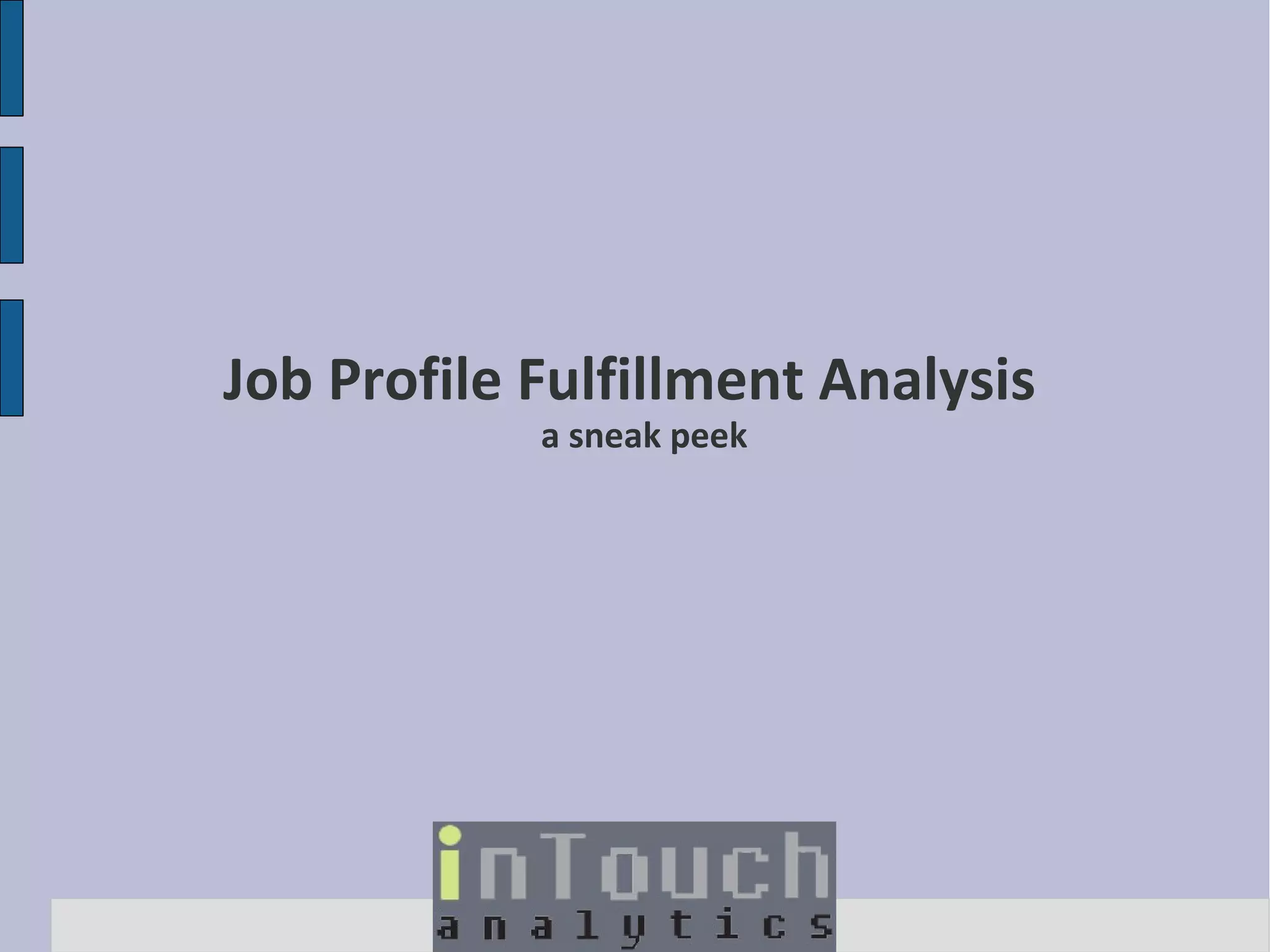 The document evaluates the effectiveness of job profiles in fulfilling staffing mandates, suggesting that a data-driven approach could yield better fulfillment insights. It analyzes various dimensions—such as job profiles, salary, and company industry—affecting fulfillment rates and concludes that using job profiles alone is inadequate for optimal staffing outcomes. Key findings indicate significant variances in fulfillment conversion rates across different profiles and highlight the importance of matching salary levels with candidate profiles for improving recruitment effectiveness.
