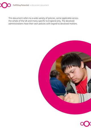 This document discusses developing a new disability strategy in the UK to enable disabled people to fulfill their potential and have opportunities to play a full role in society. It seeks input on how to overcome barriers, tackle discrimination and outdated attitudes, and give disabled people more choice and control in their lives. The minister for disabled people invites ideas on practical ways to make progress and prioritize those facing the greatest challenges to independent living. Organizations welcome the strategy's focus on disabled people's lived experiences and involvement in shaping the strategy.