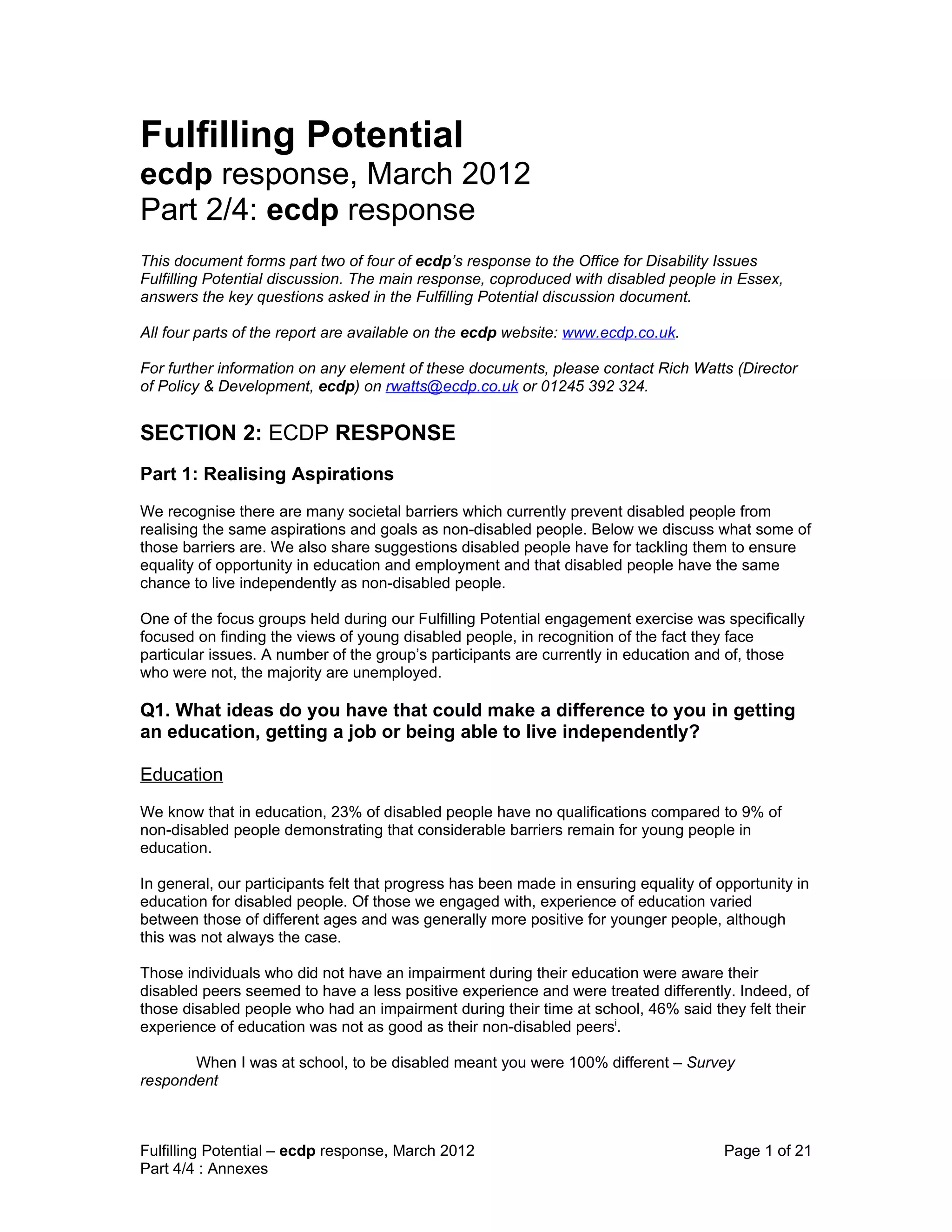 This document summarizes ecdp's response to the Fulfilling Potential discussion document. The response was co-produced with disabled people in Essex and addresses key questions about getting an education, employment, and independent living. Barriers discussed include physical access issues, negative attitudes, and a lack of support through programs like Access to Work. Suggested solutions focus on increasing disability awareness training, supporting reasonable adjustments, improving employer attitudes, and ensuring transparency and good communication about support programs. The full response is available on the ecdp website and further questions can be directed to the listed contact.