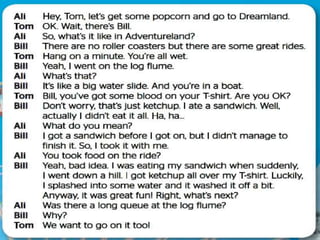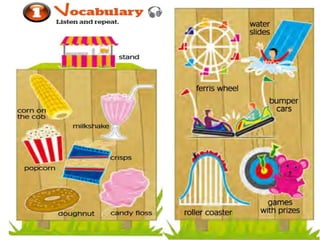 The document discusses different rides and food options available at a funfair, including roller coasters, ferris wheels, water slides, bumper cars, candy floss, doughnuts, and milkshakes. It also contains codes for different routes on highways 40, 101, 41, and 102, along with responses of "any", "no", and "some" that are not clearly defined.