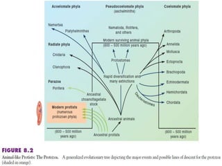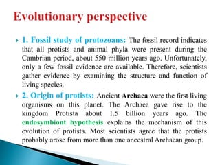 2. The earliest protozoa evolved over 1.5 billion years ago from ancient archaea. They are divided into multiple phyla based on features like nucleus type and locomotion.