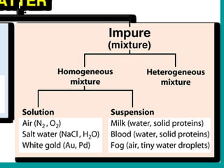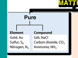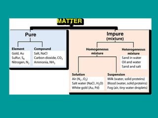 1) Matter can be classified as having physical or chemical properties, with physical changes altering physical properties but not chemical composition and chemical changes resulting in new substances.