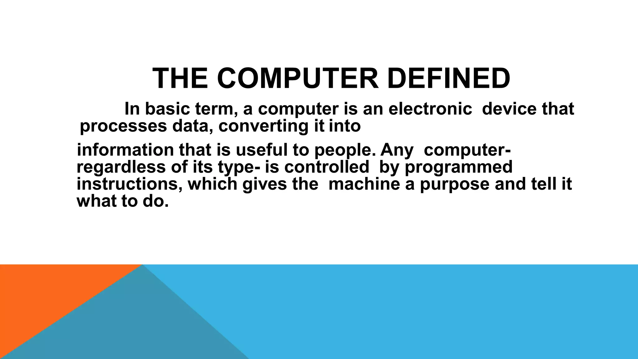 A computer is an electronic device that processes data into useful information, with various types including personal computers, mainframe computers, minicomputers, and supercomputers. Components of a computer system consist of hardware, software, and data, with hardware categorized into input and output devices, while software is divided into system, application, and utility types. The motherboard connects all components, facilitating communication through buses, while CPUs serve as the brain that processes instructions and executes tasks.