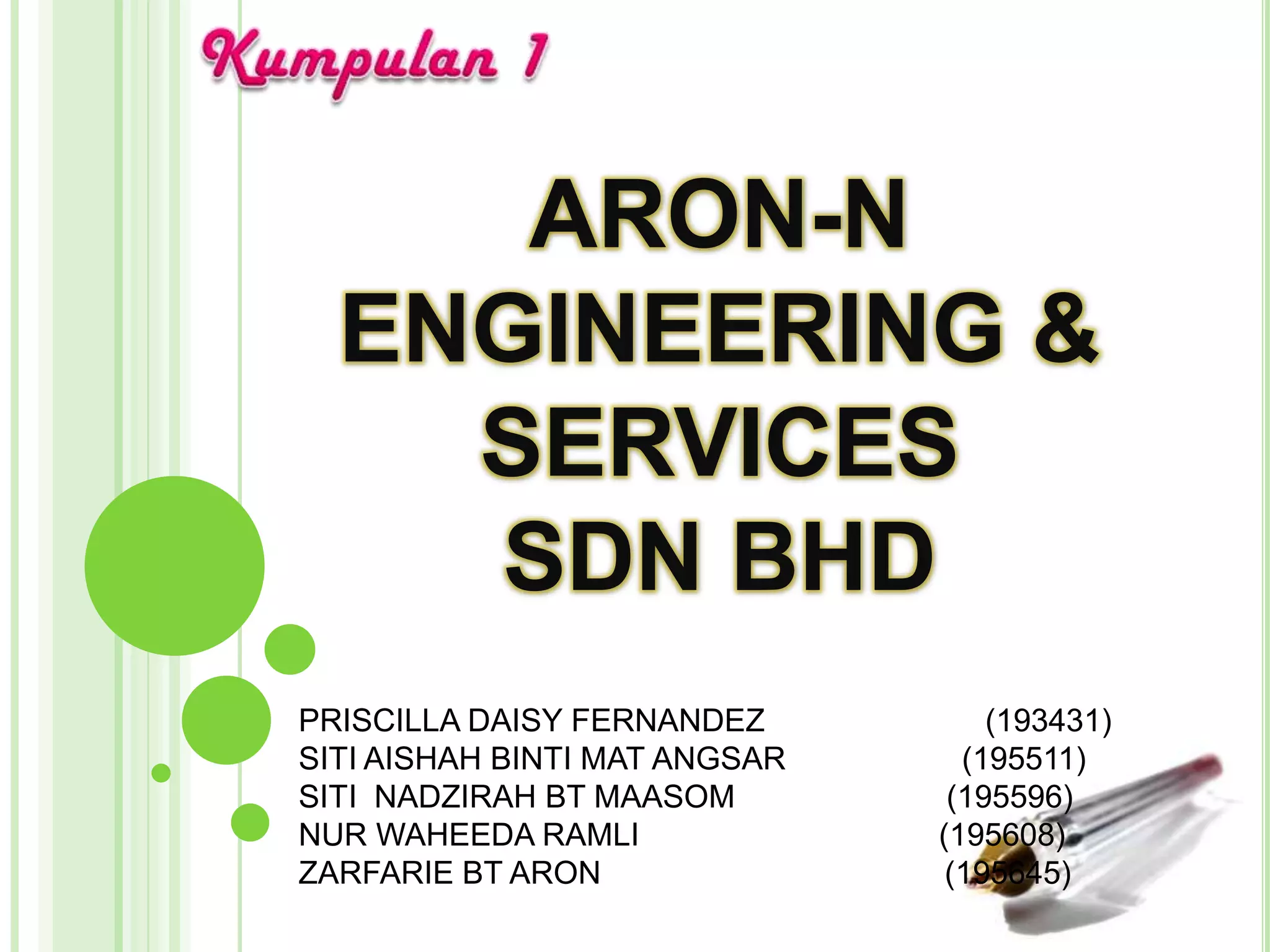 Dokumen tersebut memberikan informasi mengenai perniagaan Aron-N Engineering & Services Sdn Bhd yang bergerak dalam bidang perkhidmatan kejuruteraan dan pengeluaran. Syarikat ini ditubuhkan pada tahun 1995 dan menyediakan perkhidmatan kepada industri logam dan kejuruteraan.