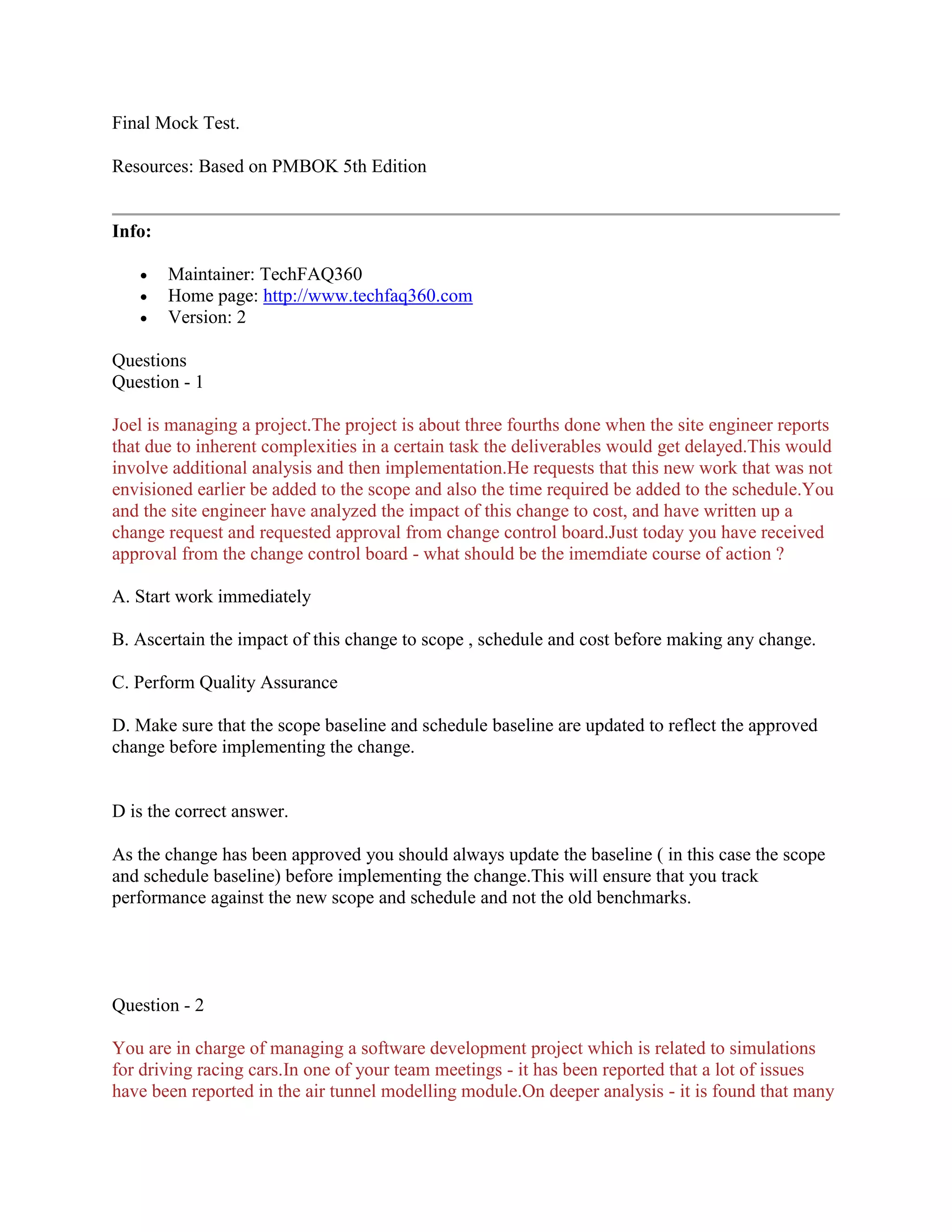 The document contains details about a final mock test for project management based on the PMBOK 5th edition. It includes 10 multiple choice questions related to project management processes and best practices. The questions cover topics like integrated change control, corrective vs preventive actions, communication management, contract types, and risk management.
