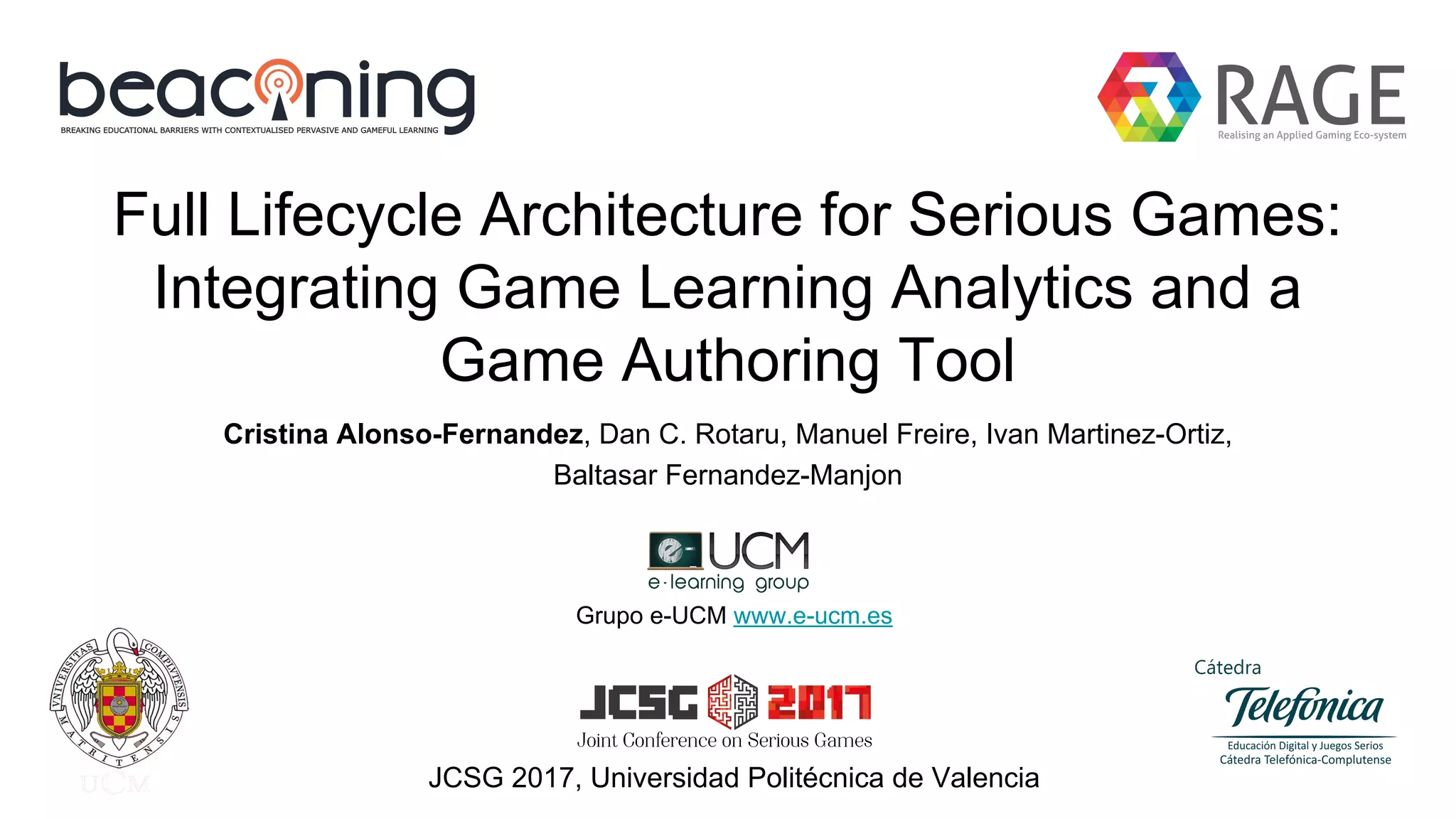 This document proposes a full lifecycle architecture for integrating game learning analytics into serious games. It includes tracking player interactions during game play, analyzing the data in real-time, and visualizing insights for various stakeholders like teachers and students. The architecture standardizes analysis using the xAPI tracking model and implements the approach in the uAdventure game authoring tool to reduce the effort required for analytics integration. The goal is to provide meaningful feedback throughout development and use of serious games to improve both learning and game designs.