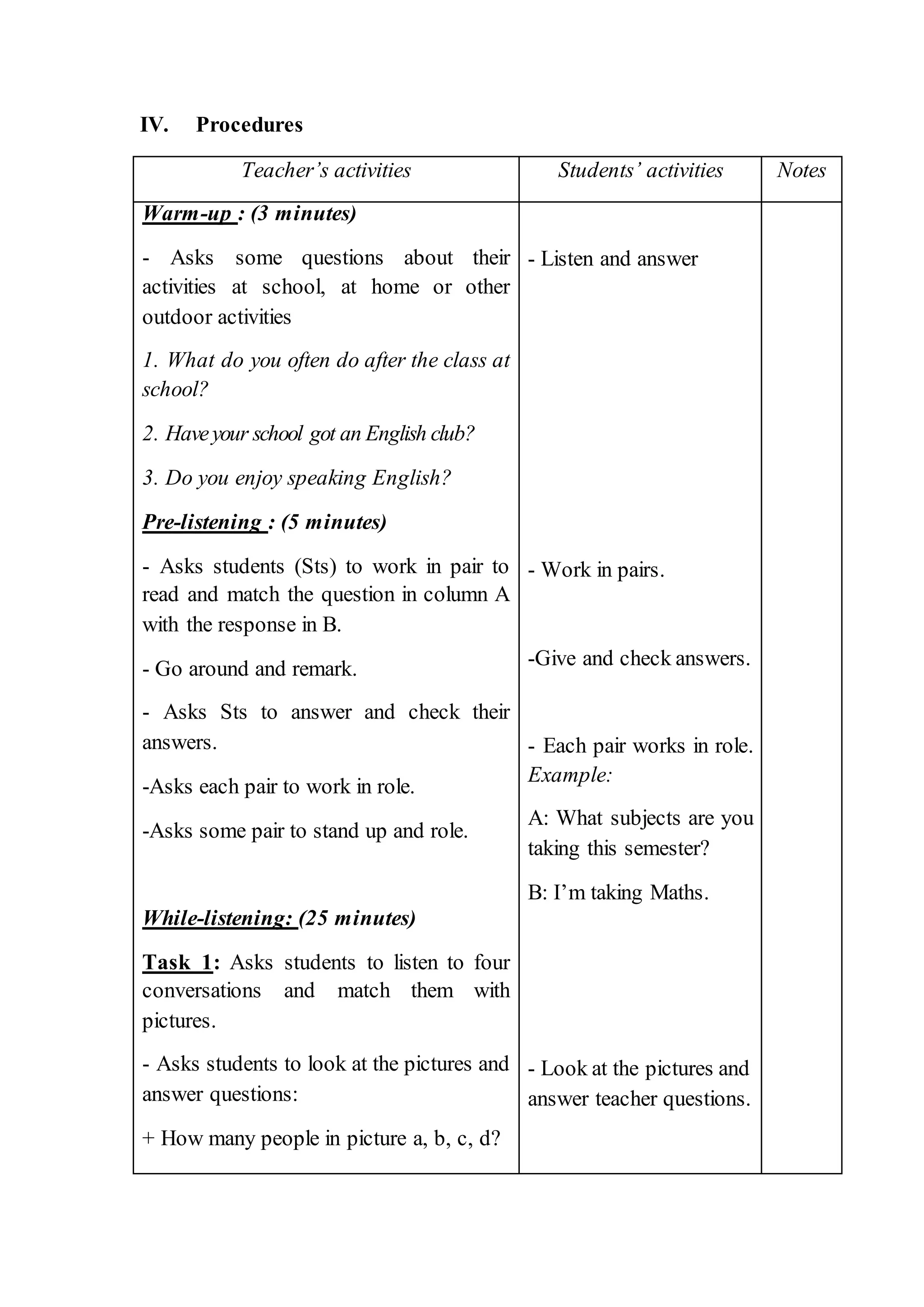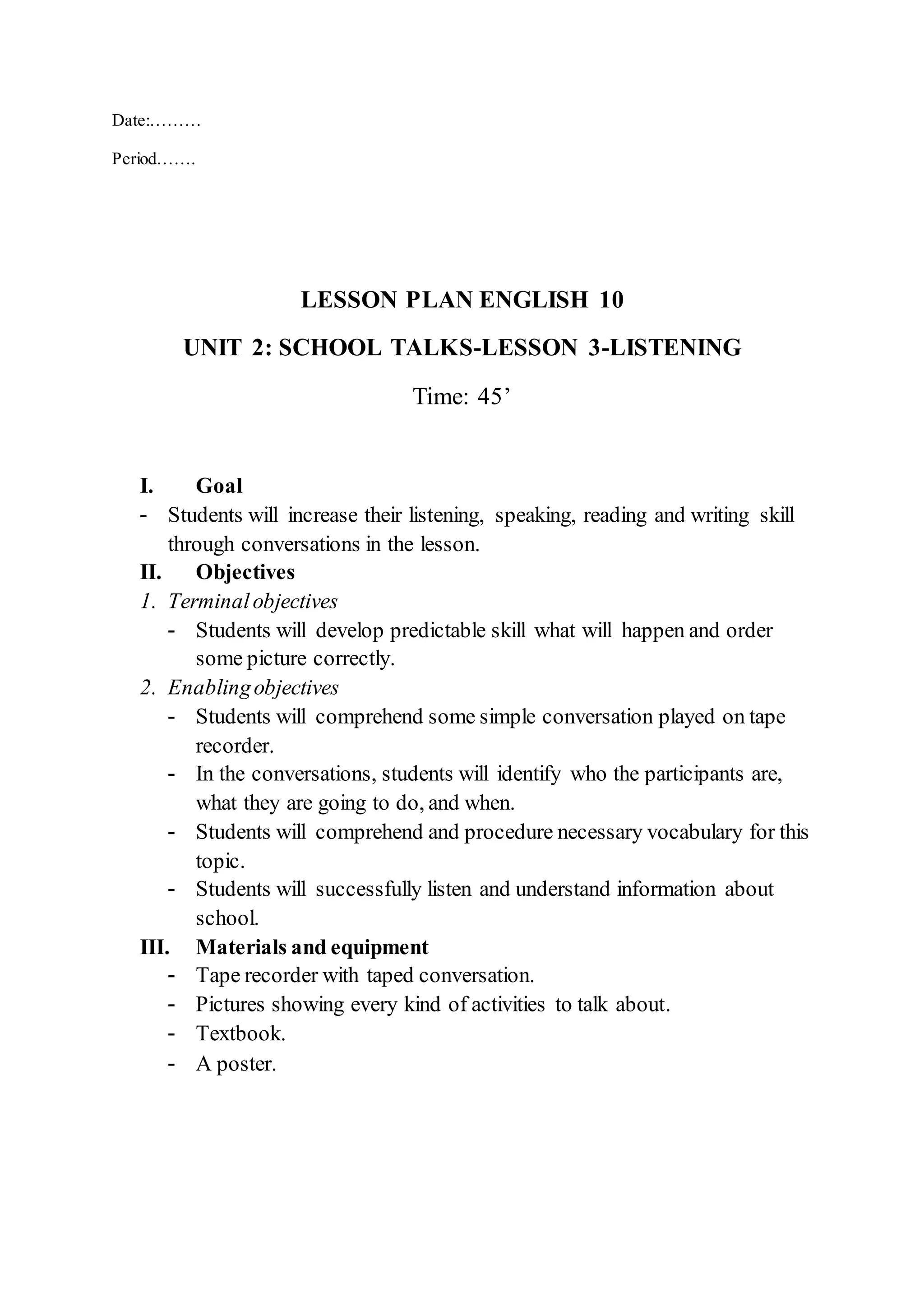 The lesson plan aims to develop students' English listening, speaking, reading and writing skills through conversations about school. Students will listen to conversations, identify participants and activities, and answer comprehension questions to practice necessary vocabulary. They will match conversations to pictures, fill in missing words, and prepare and perform their own conversations about school subjects, holidays and activities. The goal is for students to improve their ability to listen and understand information about school.