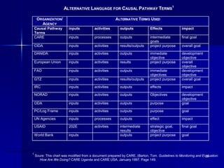 The document provides an overview of program design, monitoring and evaluation. It discusses conducting needs assessments to understand community needs and priorities. It also covers developing a causal pathway framework to link program activities, outputs, and outcomes. Monitoring and evaluation are presented as important parts of the process to determine what is working and how programs can be improved.
