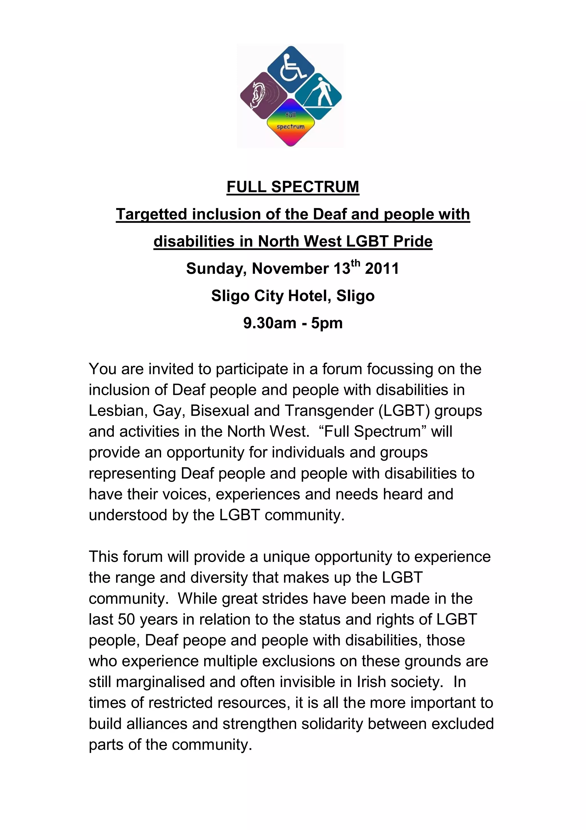 This document announces a forum called "Full Spectrum" focusing on including deaf people and people with disabilities in LGBT groups and activities in the North West of Ireland. The forum will be held on November 13th, 2011 at the Sligo City Hotel from 9:30am to 5pm. It will provide an opportunity for individuals and groups representing deaf people and people with disabilities to share their experiences and needs with the LGBT community. The program will include deaf awareness training, a presentation on issues relating to physical and sensory disabilities, parallel sessions on topics like Asperger's syndrome and mental health, and a feedback session to set goals for inclusion.