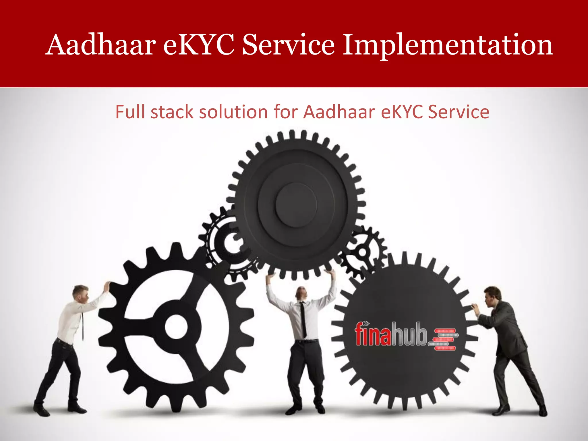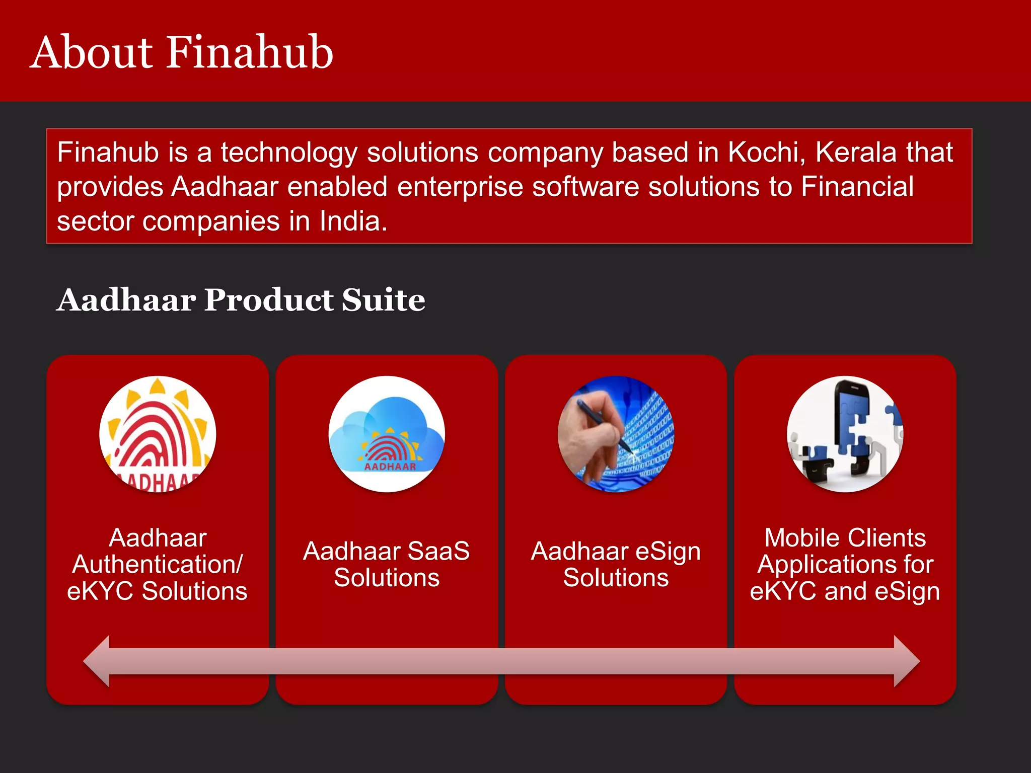 Finahub, a technology solutions company based in Kochi, Kerala, offers Aadhaar-enabled eKYC services to financial sector companies in India, including authentication and secure data storage solutions. Their offerings include a complete software suite, consultancy for Aadhaar compliance, and a scalable architecture for easy integration with existing systems. The document outlines their implementation process and product capabilities, including REST APIs and deployment options.