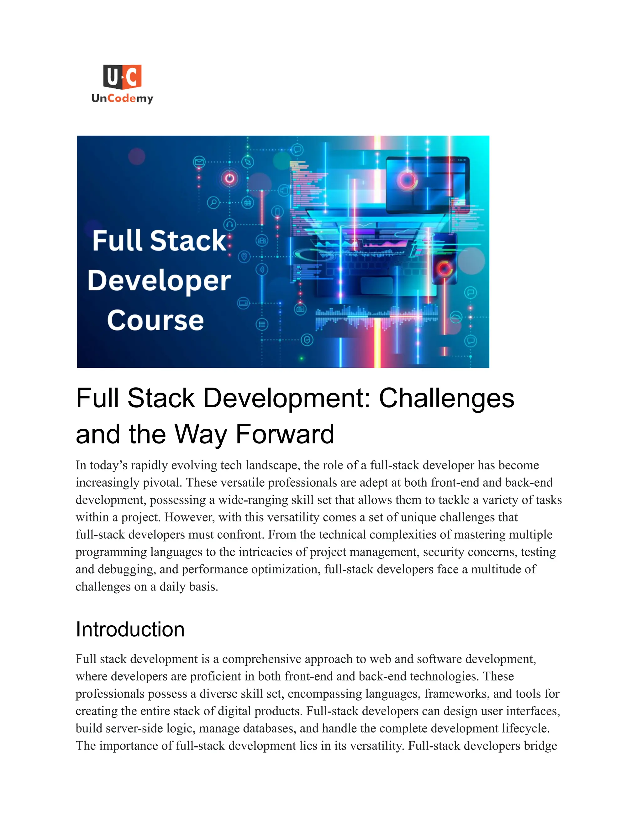 Full stack development is vital in modern tech, with developers skilled in both front-end and back-end tasks, though they face numerous challenges such as managing diverse skill requirements, project timelines, and security. Key challenges include technical complexities, project management issues, security concerns, and performance optimization needs. Continuous learning, effective communication, regular security audits, comprehensive testing, and performance monitoring are essential strategies to overcome these challenges and succeed in the field.