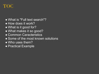 Full text search allows searching large documents and databases by examining all words in stored documents to match search terms, rather than just searching for exact matches. It works by indexing documents, including word positions, and applying rules like removing common words. Queries can then search for keywords, use wildcards, and order results by relevance. Common full text search solutions include APIs like Lucene and Xapian, and servers like Sphinx and Solr, which are used by many large companies and websites to enable powerful searching of large amounts of text data.