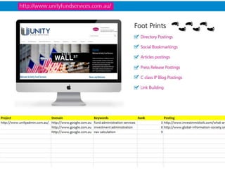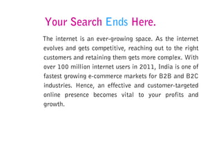 This document provides information about an online marketing agency. It states that as the internet evolves, reaching and retaining customers online becomes more complex. It emphasizes the importance of an effective online presence for business growth and profits. The agency understands a strong online presence is critical for acquiring the right customers. It offers services like SEO, internet marketing, and website content optimization to help strengthen websites and monitor visitor data to ensure effectiveness. The document also provides details about the agency's team, experience, services offered, technologies used, and client testimonials.