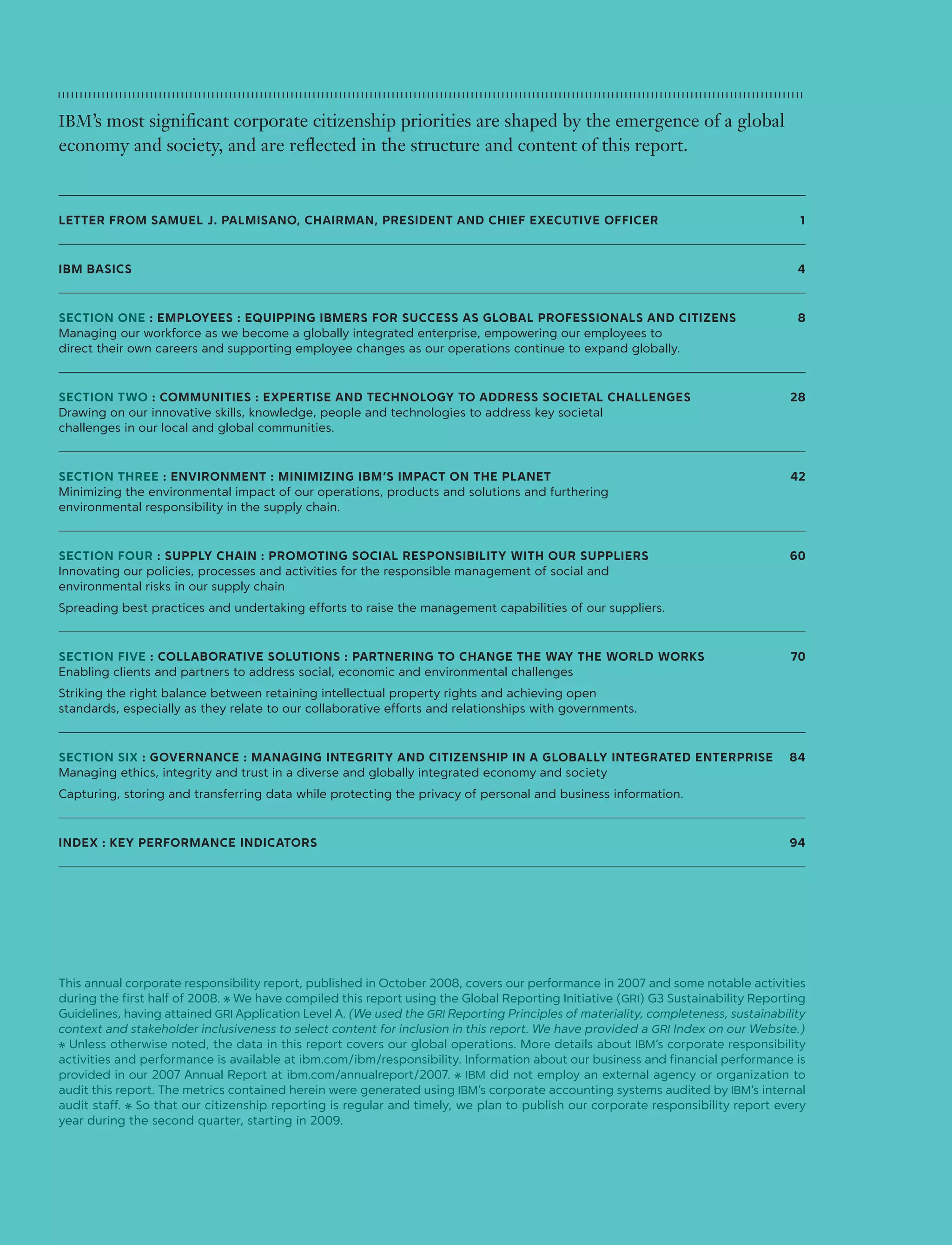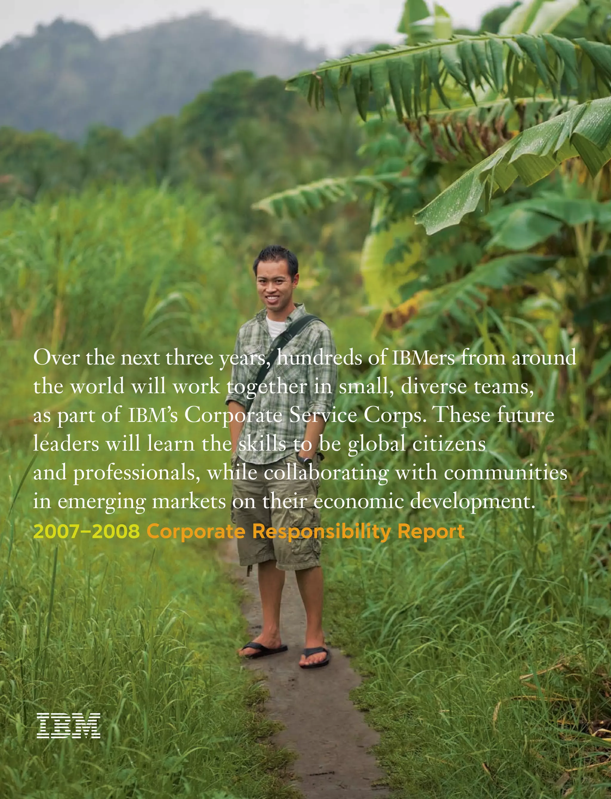 This document summarizes IBM's 2007-2008 Corporate Responsibility Report. It discusses IBM's Corporate Service Corps program, which sends teams of IBM employees around the world to work with local communities on economic development projects. It also outlines IBM's strategies and initiatives to equip employees for success as global professionals and citizens through learning and development opportunities, engagement programs, diversity initiatives, and efforts to support employee health and well-being. Key programs highlighted include the Workforce Management Initiative to help employees develop skills and access opportunities, and the Global Citizen's Portfolio aimed at giving employees global experiences.