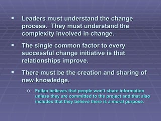 Fullan's model for change involves moral purpose, understanding the change process, and coherence making. Leaders must have a moral purpose to make a positive difference and understand that change is complex. Relationships are key and improve through sharing new knowledge and commitment. Finally, people must make sense of changes for coherence which can be difficult due to disequilibrium. Leaders must appreciate challenges, look at resistance positively, and reculture the organization through the change process.