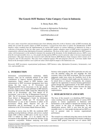 1. The document discusses a study that identified business values from IS/IT implementations in various organizations in Indonesia.