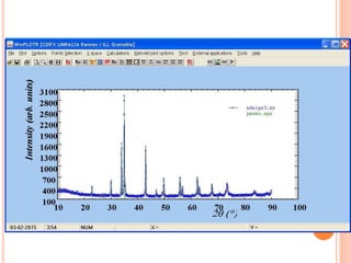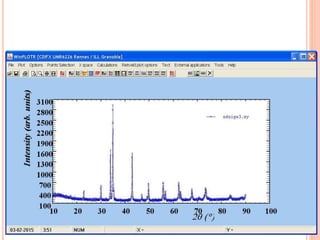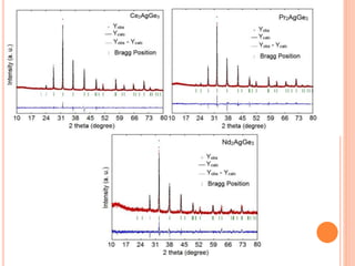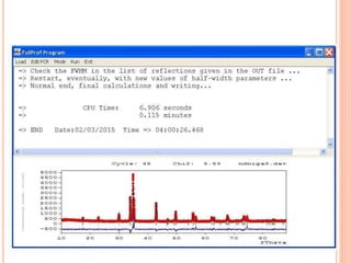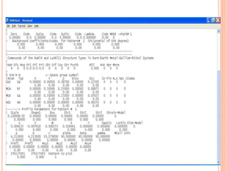 The document discusses the use of Rietveld refinement for analyzing powder X-ray diffraction data. Rietveld refinement allows for the determination of phase purity, identification of crystal structures, refinement of structural parameters, quantitative phase analysis, and calculation of properties like lattice parameters, atomic positions, thermal vibrations, grain size, and magnetic moments. The document provides examples of Rietveld refinement output and parameters that can be refined.