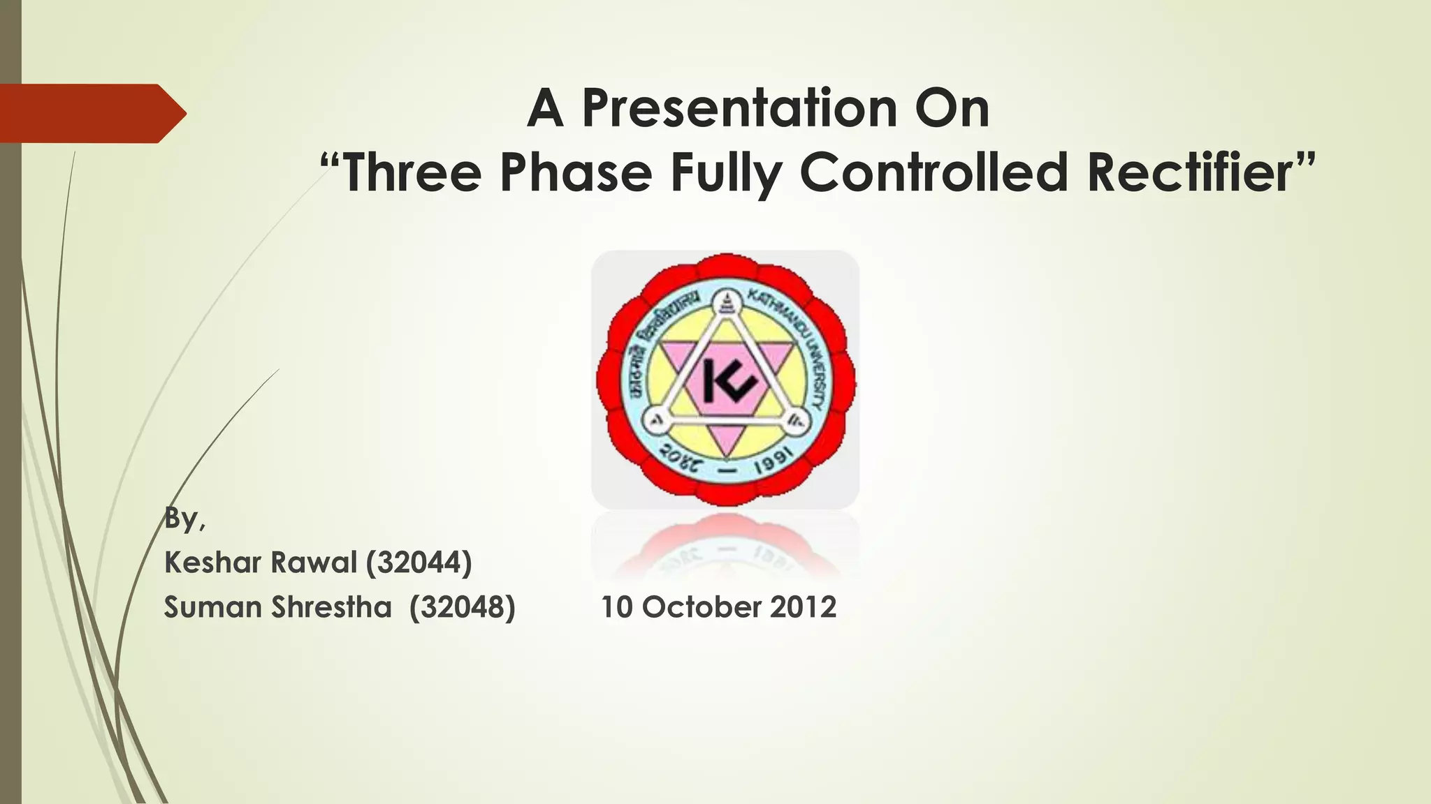 This document summarizes a presentation on a three phase fully controlled rectifier. It introduces the topic, outlines the objectives to design and fabricate the rectifier and its control unit. It describes applications of three phase rectifiers such as DC motor speed control and battery charging. Block diagrams and circuit diagrams are shown to illustrate the design.