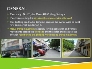 This document provides a case study for the full demolition of a 3-story commercial building located at 12, Jalan Meru in Klang, Selangor. The building needs to be demolished to make way for a new commercial building. Special precautions must be taken due to the building's concrete structure and connections to adjoining buildings. The demolition process will include relocating utility lines, erecting safety hoarding, clearing debris, and properly disposing of waste off-site.