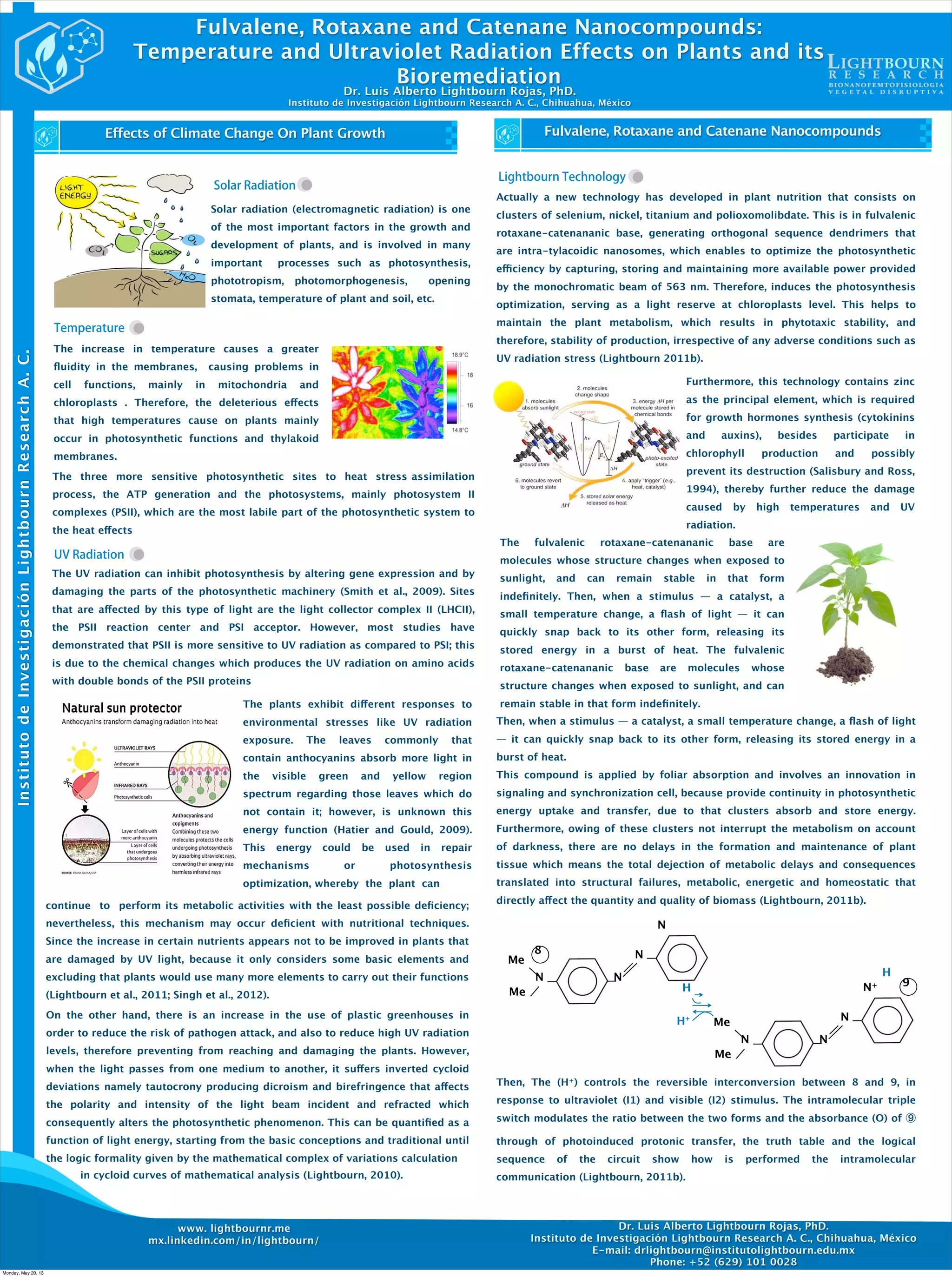 The document discusses the effects of increased temperature and UV radiation from climate change on plant growth and potential bioremediation methods. It describes how higher temperatures and UV radiation can damage plant cell functions and photosynthesis. A new plant nutrition technology is presented using fulvalene, rotaxane, and catenane nanocompounds that form intra-thylakoid nanosomes to optimize photosynthesis and help maintain plant metabolism and production despite adverse conditions like UV stress. The compounds absorb and store light energy for plant use and are proposed to reduce damage from high temperatures and UV radiation.