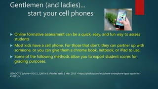 This document provides summaries of several online formative assessment tools that can be used with students using cell phones or other devices. Kahoot, Quizizz, and Socrative are described as games or quizzes where the teacher creates questions and students respond using their devices. The document also summarizes tools for creating crosswords, Jeopardy-style games, image quizzes and more that can be shared online with students for review. Formative assessment is done informally during lessons to check understanding while summative assessment occurs at the end of a learning period.