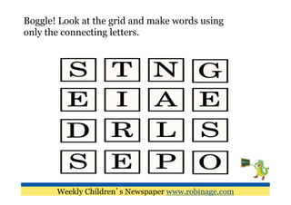 This document contains a collection of brainteasers and puzzles for kids, including word games, riddles, and logic problems. It presents various activities like Boggle, unscrambling words, finding hidden words, identifying odd ones out, filling in blanks, decoding clues, and solving riddles. The puzzles cover topics such as spelling, vocabulary, critical thinking, and observation skills. Answers are provided at the end for checking solutions. The document aims to make learning fun for children through interactive challenges.