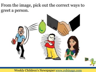 The document is a weekly children's newspaper that teaches good manners and proper behavior. It includes puzzles and activities where children can practice greeting others, treating all with respect, speaking the truth, and being responsible by cleaning up. The newspaper also has scenarios to teach children what to do if a friend is injured or how to behave respectfully towards elders on public transportation. The answers provided reinforce behaving politely, caring for others in need, and showing respect.