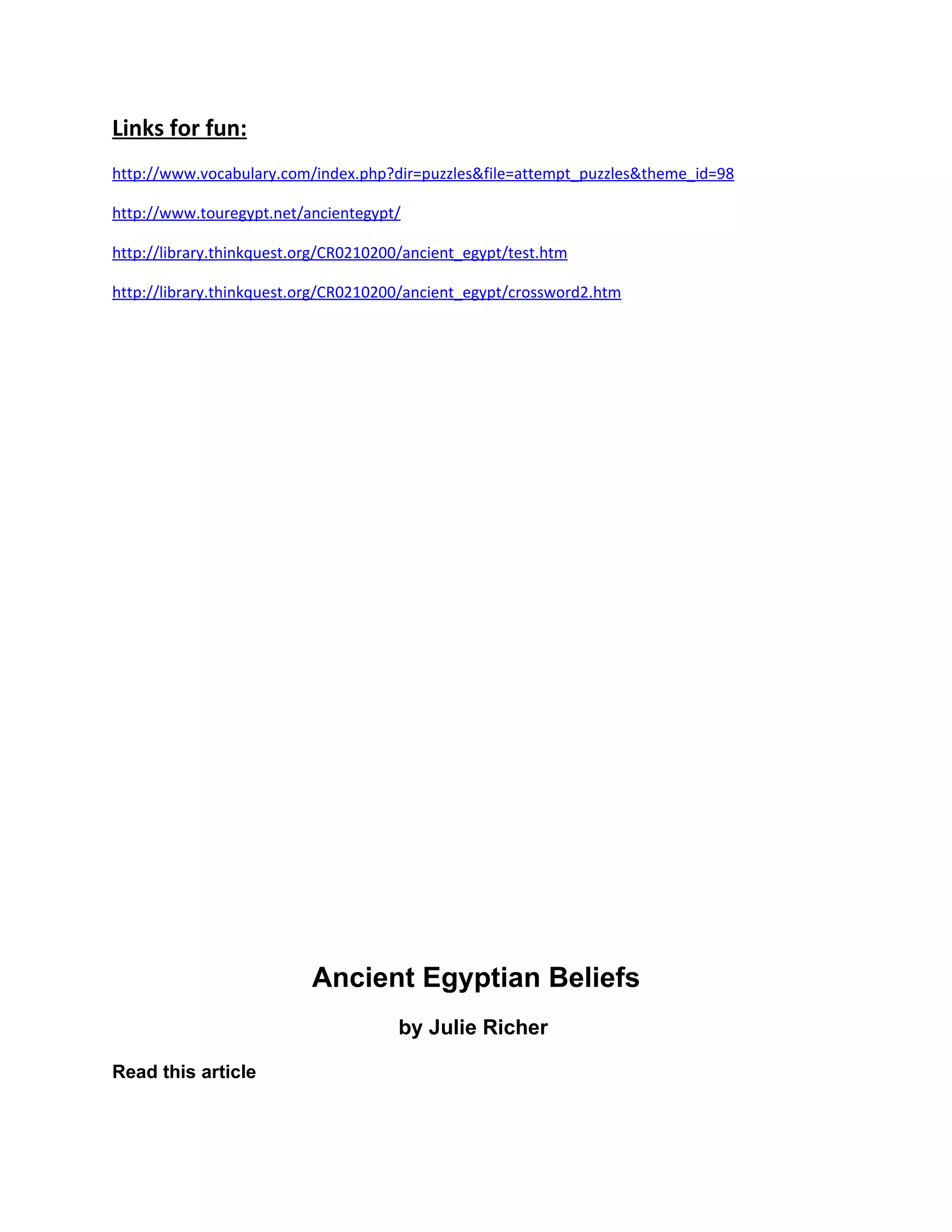 This document summarizes some of the religious beliefs of ancient Egyptians based on artifacts and texts that have been discovered. It discusses how the Book of the Dead provided insights into judgments of the dead and their journey to the afterlife. Hieroglyphs on temple walls also revealed myths like that of Isis and Osiris, where Isis used magic to resurrect her husband Osiris and later their son Horus defeated Seth to become king. Archaeological sites like the Valley of the Kings containing tombs like Tutankhamun's have furthered understanding of Egyptian afterlife beliefs.