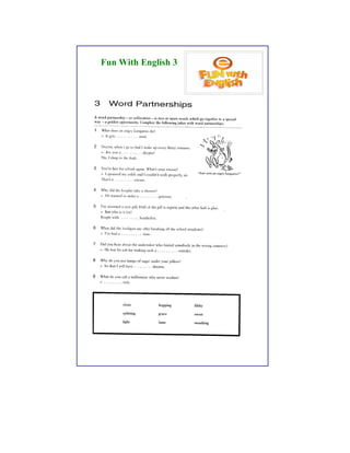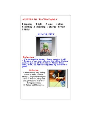 The document presents answers to the 'Fun with English 3' exercise and includes reflections on creativity and caution against greed. It emphasizes the importance of patience in a fast-paced society where people often rush through meals. The narrative warns against being deceived by con artists using clever tricks.