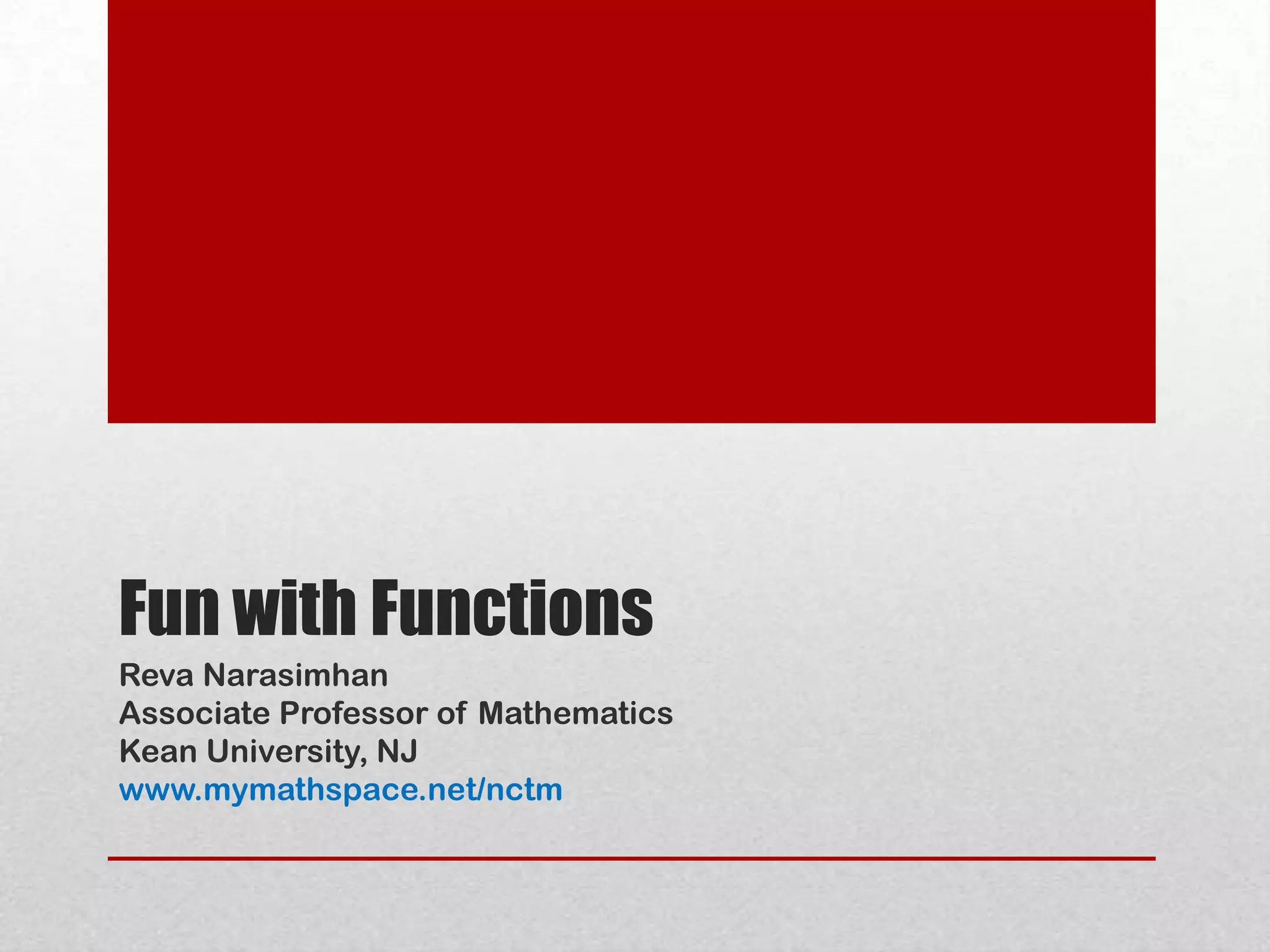 The document discusses teaching functions in mathematics. It provides examples of using real-world applications to introduce functions and related concepts in an engaging way. Some challenges in teaching functions are balancing skills practice with conceptual understanding and addressing time constraints. The document also discusses using technology to enhance function lessons without replacing pencil-and-paper work. Overall, it advocates for an application-driven approach to teaching functions.