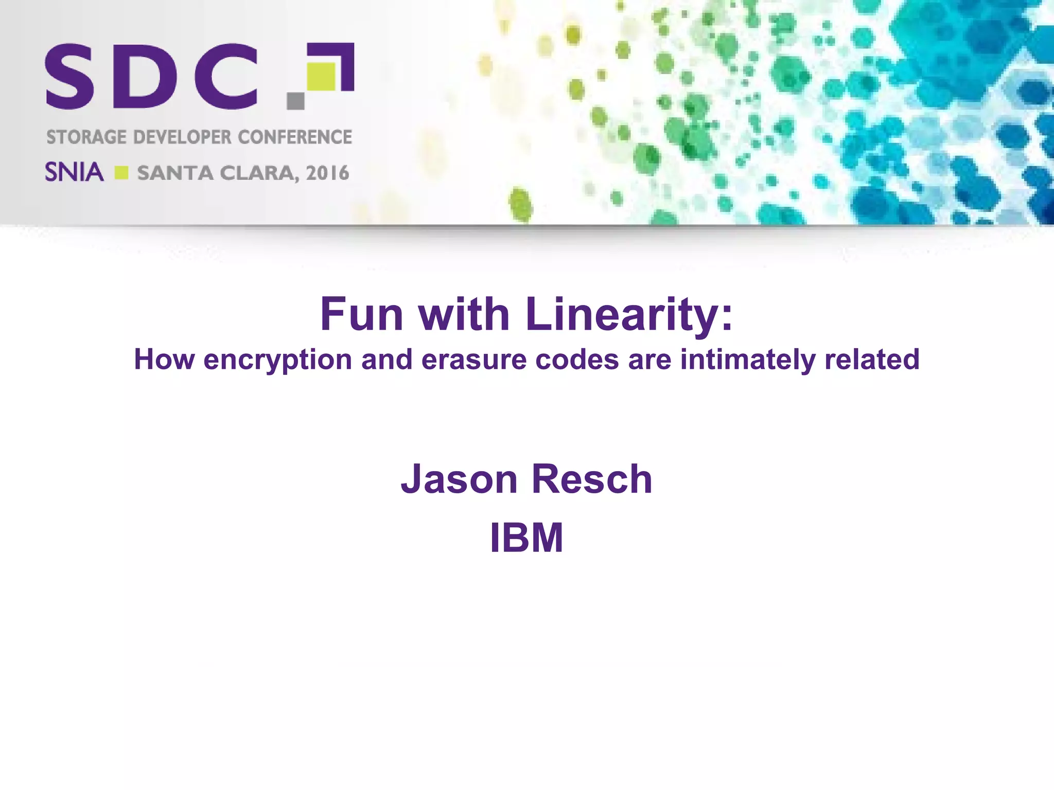 The document discusses how encryption and erasure codes are related through their use of linear functions. It explains that both encryption and erasure codes operate as linear functions in finite fields, allowing their outputs to be combined. This property allows encrypted or erasure coded data to be rekeyed or rebuilt without retrieving the original data. It also enables verifying integrity of erasure coded data without decoding it first. The document explores these applications and concludes that linearity opens opportunities for innovation in distributed storage systems.
