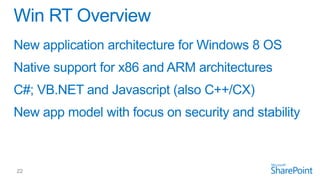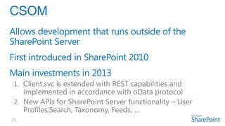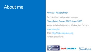 This document provides information about Erich Harlan's work experience with RealDolmen and his expertise with SharePoint. It also includes links to resources about SharePoint development using the client object model and retrieving social feeds. Key technologies discussed include AppFabric, the client object model libraries, social feed APIs, and links to MSDN documentation on these topics.