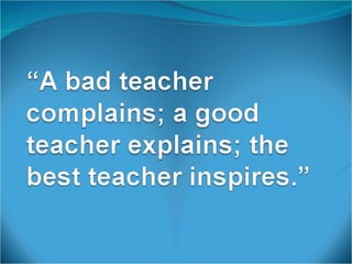 This document tells the story of Mrs. Thompson, a teacher who initially did not like one of her students, Teddy Stoddard. Through reviewing his past records, she learned that Teddy had a difficult home life after losing his mother to illness. Over the year, Mrs. Thompson paid Teddy extra attention and inspired him. Teddy went on to graduate top of his class from high school and college, and became a successful doctor. He remained in contact with Mrs. Thompson, crediting her for believing in him and inspiring him to succeed. Their relationship showed how teachers can make a profound difference in students' lives through encouragement.