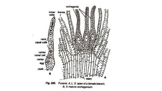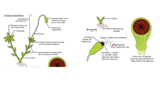 This document summarizes the morphology and life cycle of the moss Funaria. It belongs to the division Bryophyta, class Bryopsida, order Funariales and family Funariaceae. Funaria hygrometrica is the most common and widespread species. It grows in moist, shady places. The plant body is a gametophyte that is differentiated into a protonema and upright gametophores. It reproduces sexually through antheridia and archegonia on separate gametophores, and vegetatively through fragmentation. Fertilization occurs when sperm are released from antheridia and travel to archegonia. This results in a sporophyte called a sporogonium that