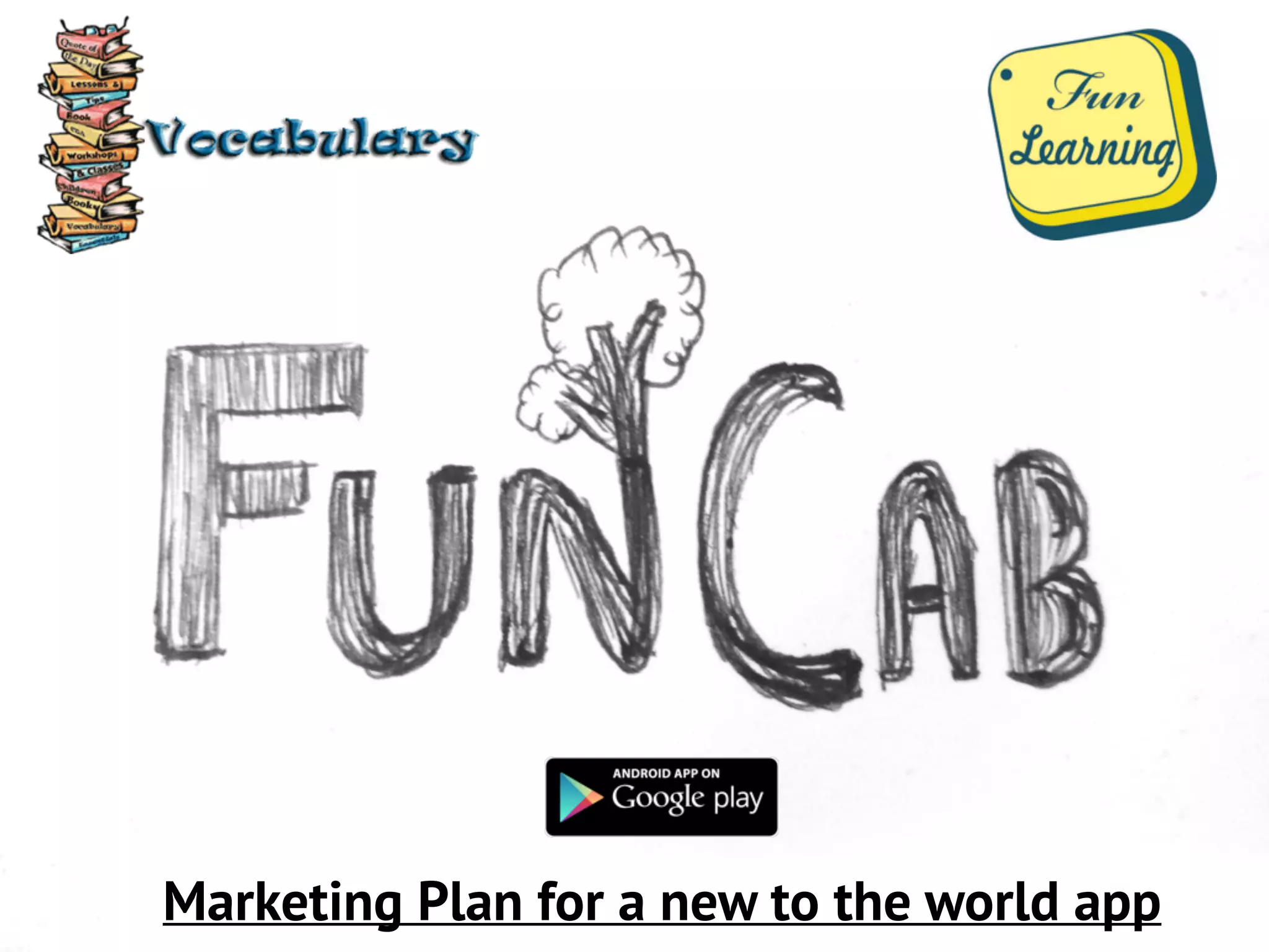 The document provides a marketing plan for a new vocabulary learning app called FunCab. The app aims to help students aged 18-24 improve their vocabulary through associating words with visuals, phrases and media like videos and articles. It analyzes the target market of 7.7 million students in India and competitors like VoLT. The plan discusses strategies around the app's unique approach, goals to achieve 1 million users and 5% paid conversion. It proposes a freemium pricing model and advertising the app through social media and colleges. The 6 month plan includes market research, app development, pricing and launch.