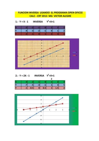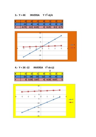 This document contains instructions for students to graph functions and find their inverse functions. It provides 15 examples of functions in the form of y=fx(x) and asks students to graph and find the inverse of each function. The functions range from linear to quadratic and include division, multiplication, addition and subtraction. The purpose is to practice skills in graphing functions and determining the inverse relationship between x and y.
