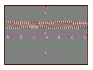 The document describes three trigonometric functions with periods of 2 and amplitudes of 300 or -300. The first function is y=sinx. The second is y=2sin(4x+300)+5, and the third is y=2sin(4x-300)+5. A table is given showing the values of x, y, y^2, and y^3 for values of x from -30 to 30. The document was presented by Mary Barrera and discusses trigonometric functions.