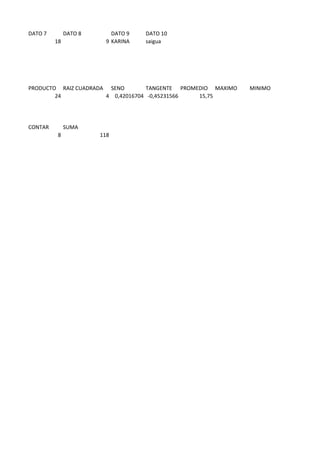 8 DATO 9 DATO 10 18 9 KARINA saigua PRODUCTO RAIZ CUADRADA SENO TANGENTE PROMEDIO MAXIMO MINIMO 24 4 0,42016704 -0,45231566 15,75 CONTAR SUMA 8 118