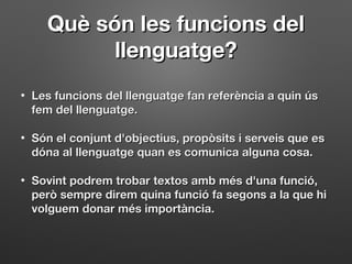 • Les funcions del llenguatge fan referència a quin úsLes funcions del llenguatge fan referència a quin ús