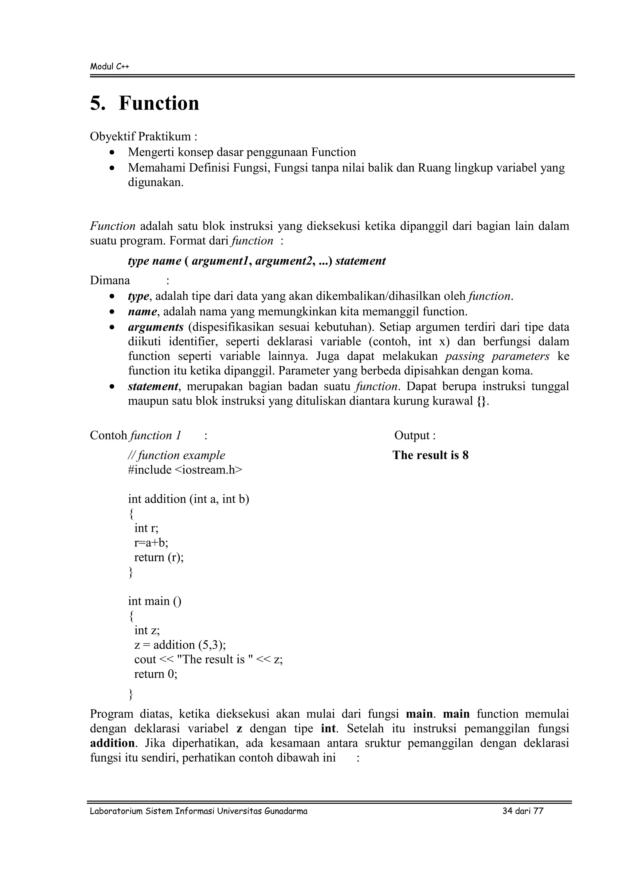 Modul ini membahas konsep dasar penggunaan function dalam bahasa C++. Function adalah blok kode yang dapat dipanggil berulang kali, dengan parameter yang dapat diubah. Modul ini menjelaskan cara definisi, pemanggilan, dan penggunaan parameter function, serta contoh kasus penggunaannya seperti rekursi dan overloaded function.