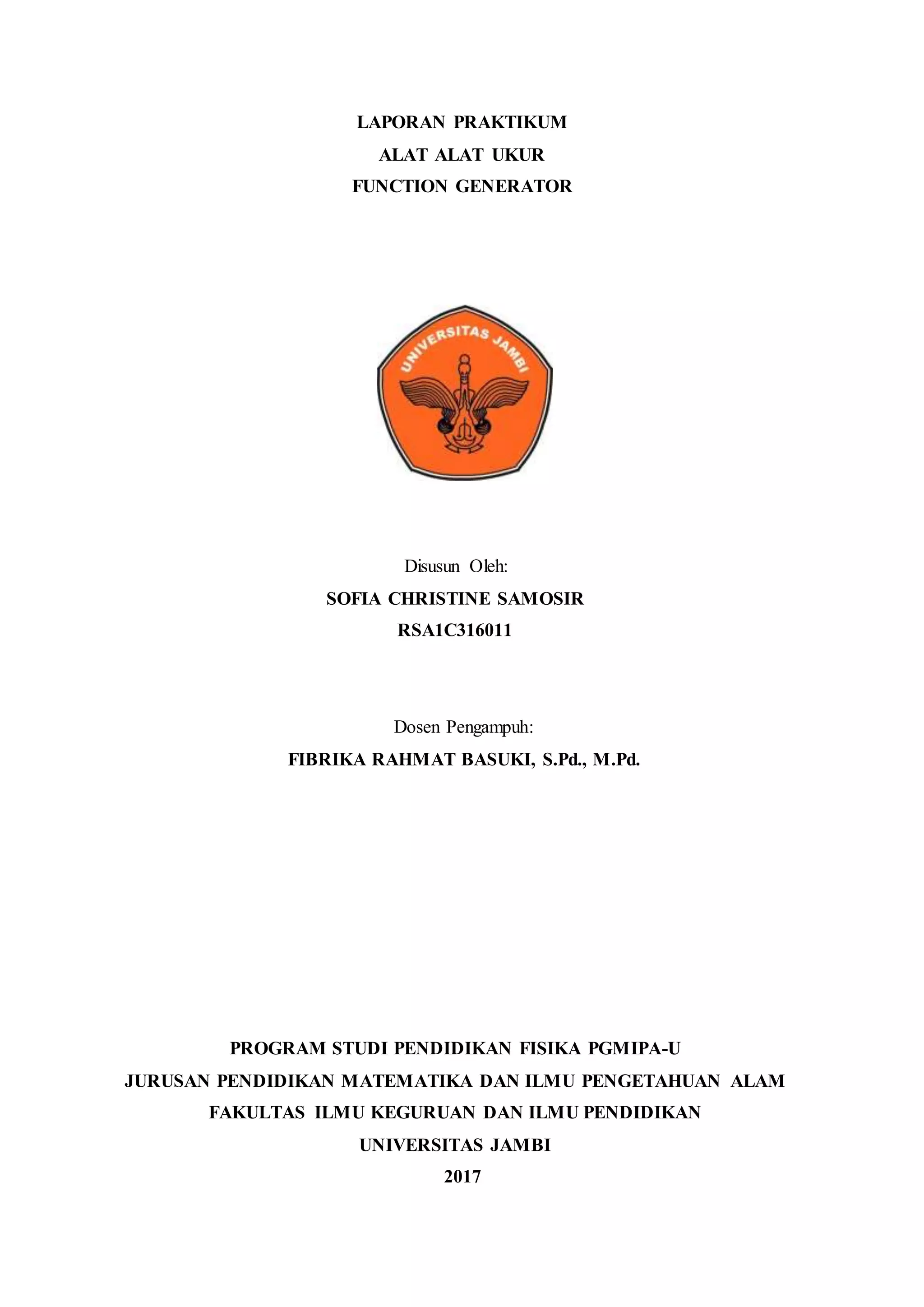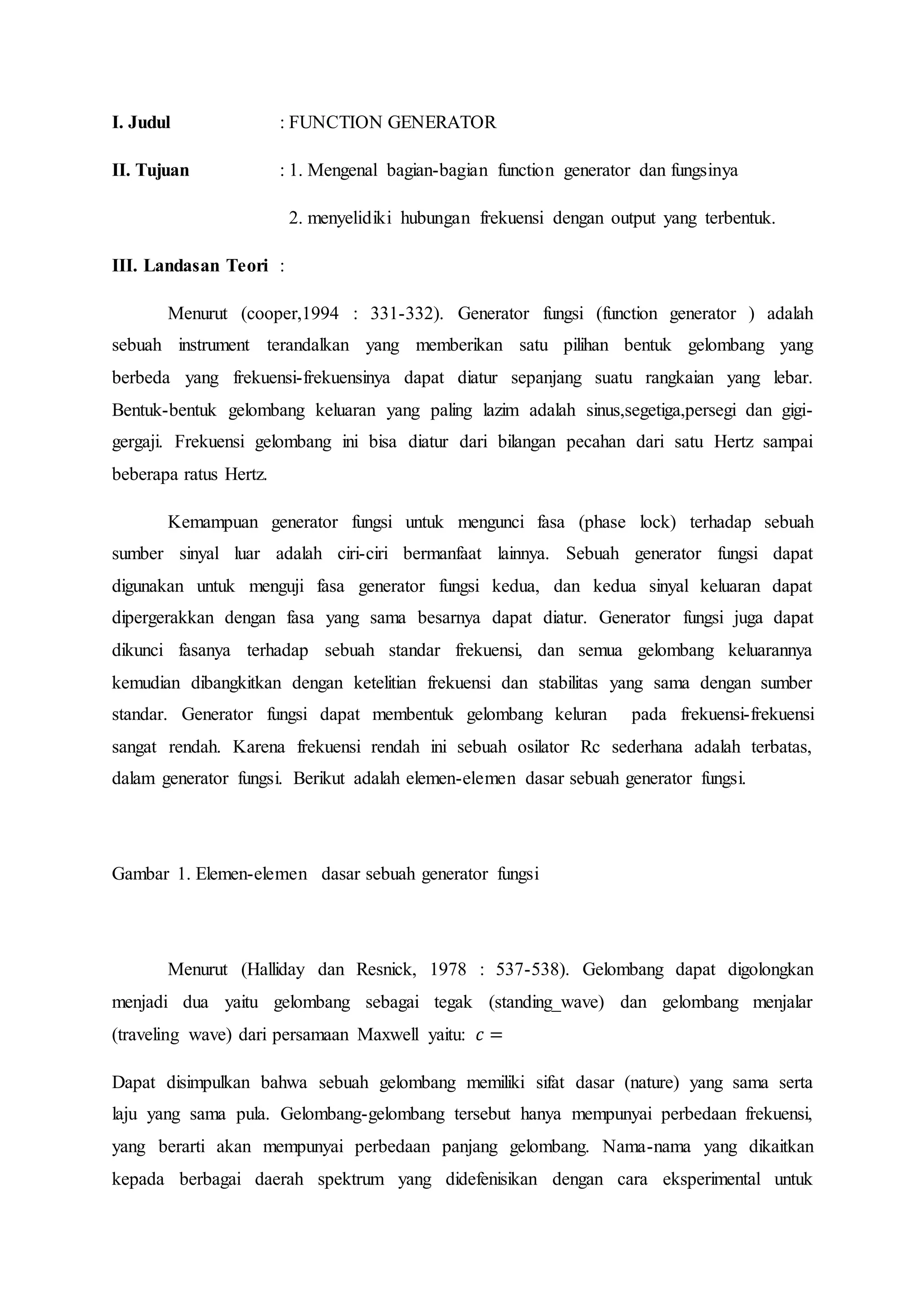 Laporan praktikum ini membahas percobaan mengenai function generator. Tujuannya adalah mengenal bagian-bagian dan fungsi function generator serta menyelidiki hubungan antara frekuensi dengan bentuk gelombang yang dihasilkan. Percobaan dilakukan dengan mengatur frekuensi pada function generator dan mengamati bentuk gelombang pada osiloskop. Hasilnya menunjukkan semakin besar frekuensi, gelombang akan semakin rapat.