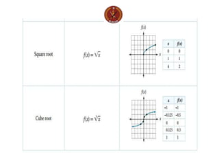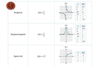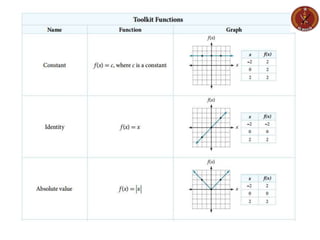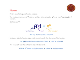 This document provides an overview of function notation and how to work with functions. It defines what a function is as a relation that assigns a single output value to each input value. It shows how functions can be represented using standard notation like f(x) and discusses evaluating functions by inputting values. Examples are provided of determining if a relationship represents a function, evaluating functions from tables and graphs, and solving functional equations.